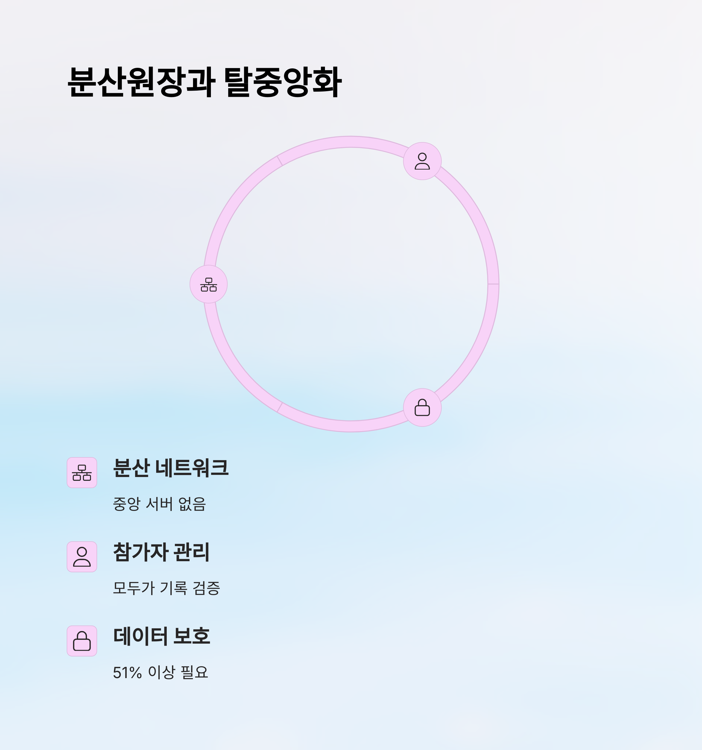 - 탈중앙화: 권력이 한 곳에 집중되지 않습니다.