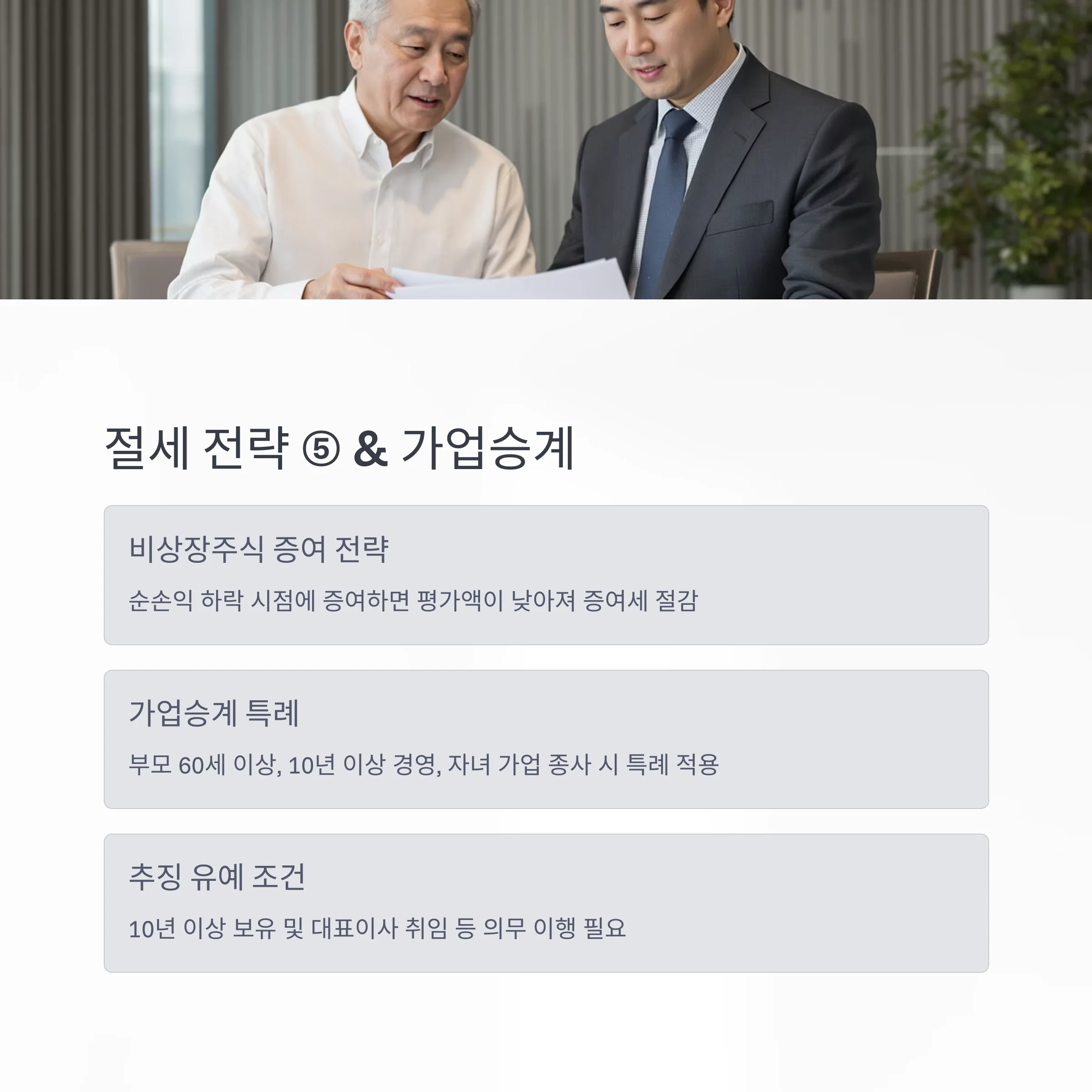 | 가업승계 특례 활용 | 수억 원 이상 절세 가능, 단 요건 엄격 |