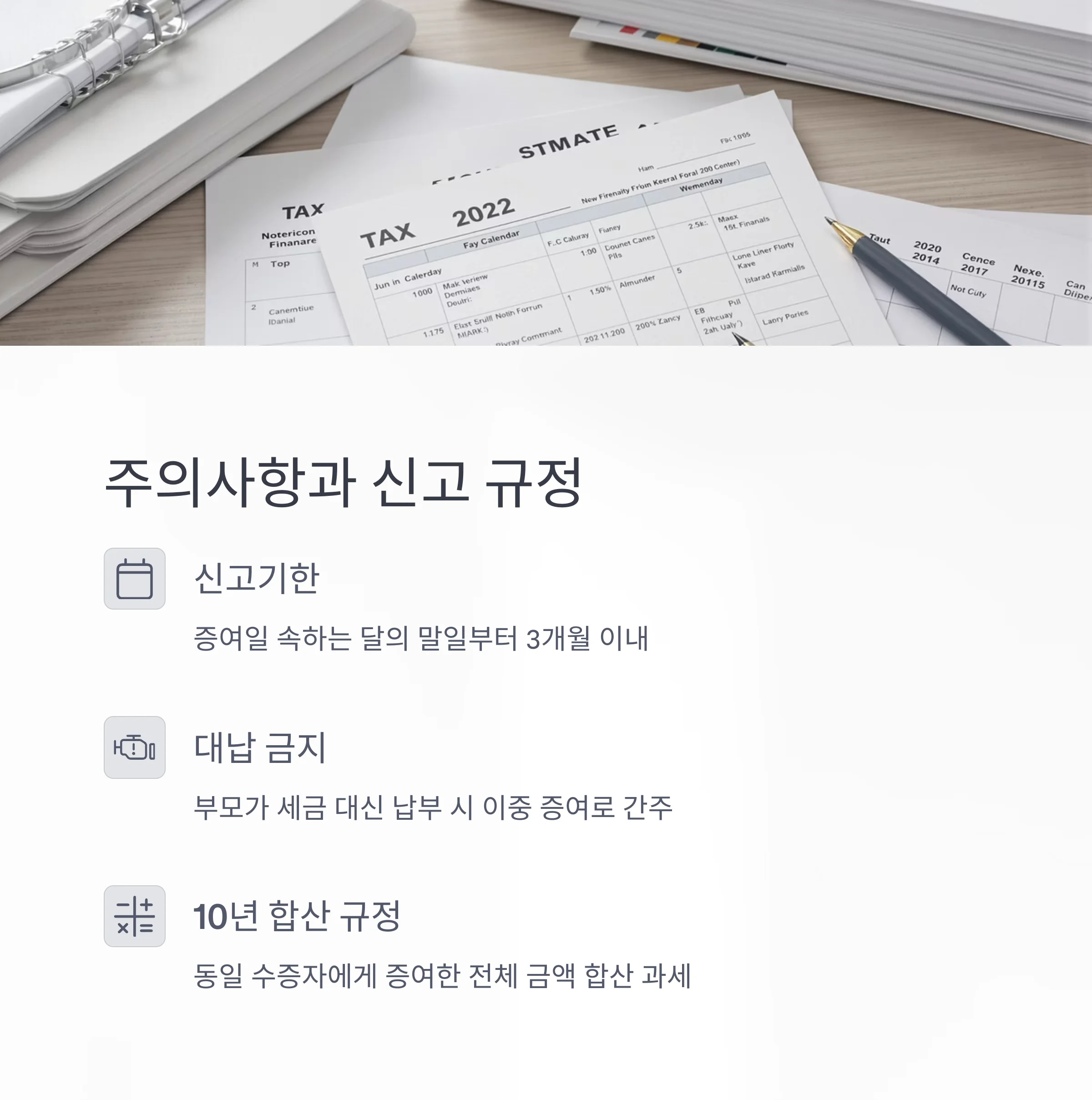 | 증여세 대납 금지 | 부모가 대신 납부 시 이중 증여로 간주 |