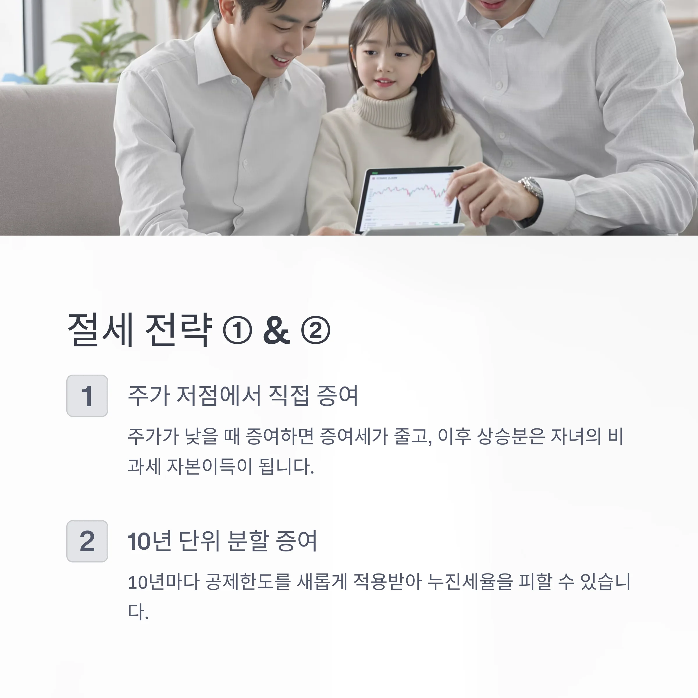 | 주가 저점 직접 증여 | 증여세 최소화 + 상승분 비과세 |