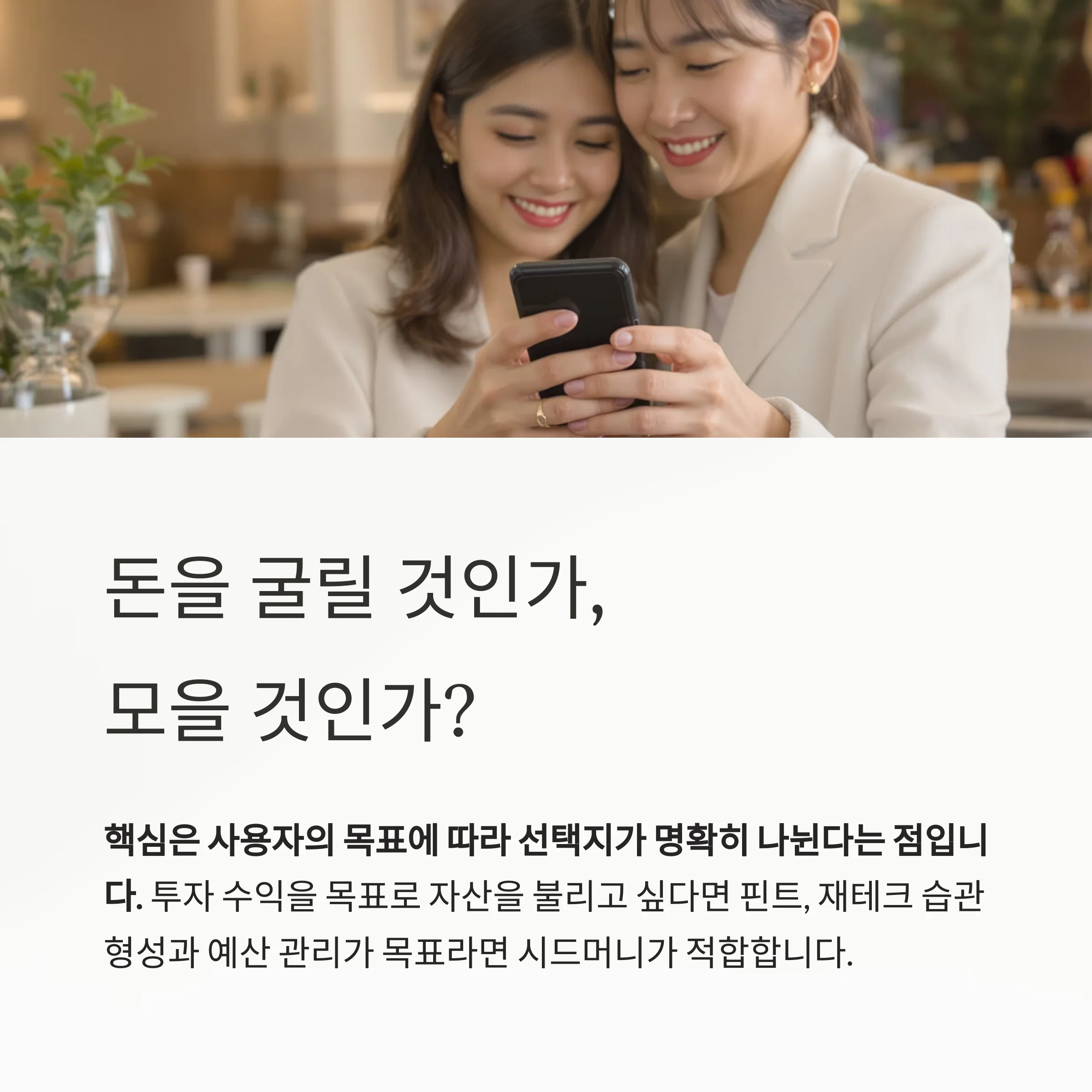 "돈을 굴릴 것인가, 모을 것인가"의 선택이 이 두 앱의 분기점이 됩니다.