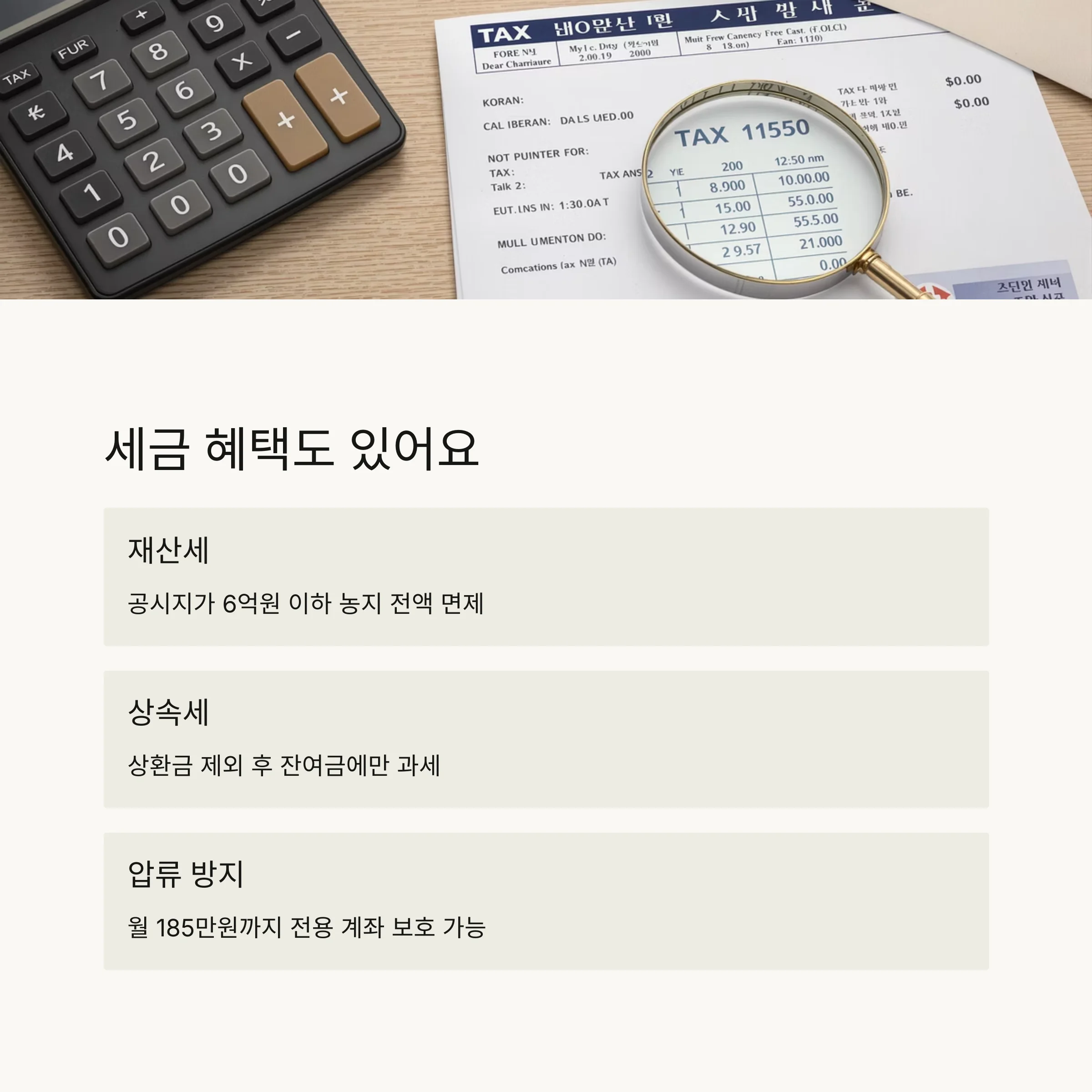 | 재산세 | 공시지가 6억 원 이하 농지 전액 면제 |