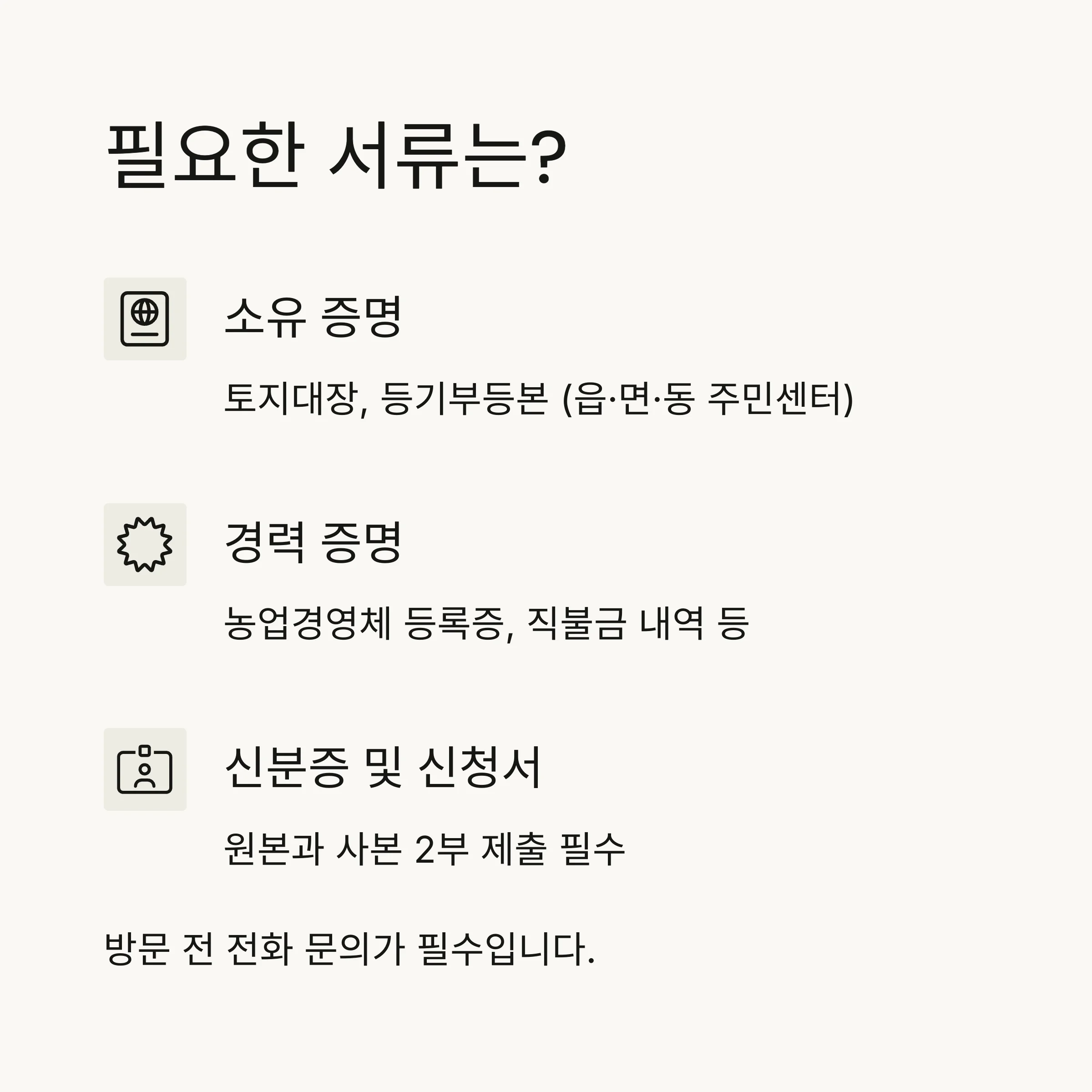 | 농지 소유 증명 | 토지대장, 등기부등본 | 읍·면·동 주민센터 |