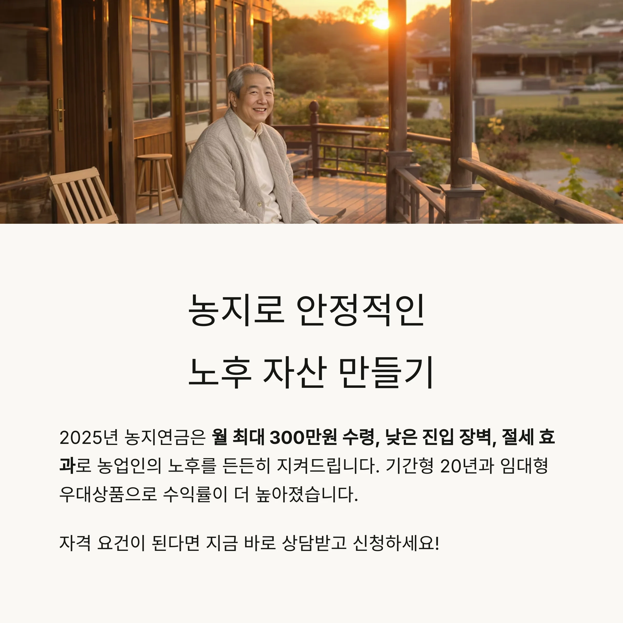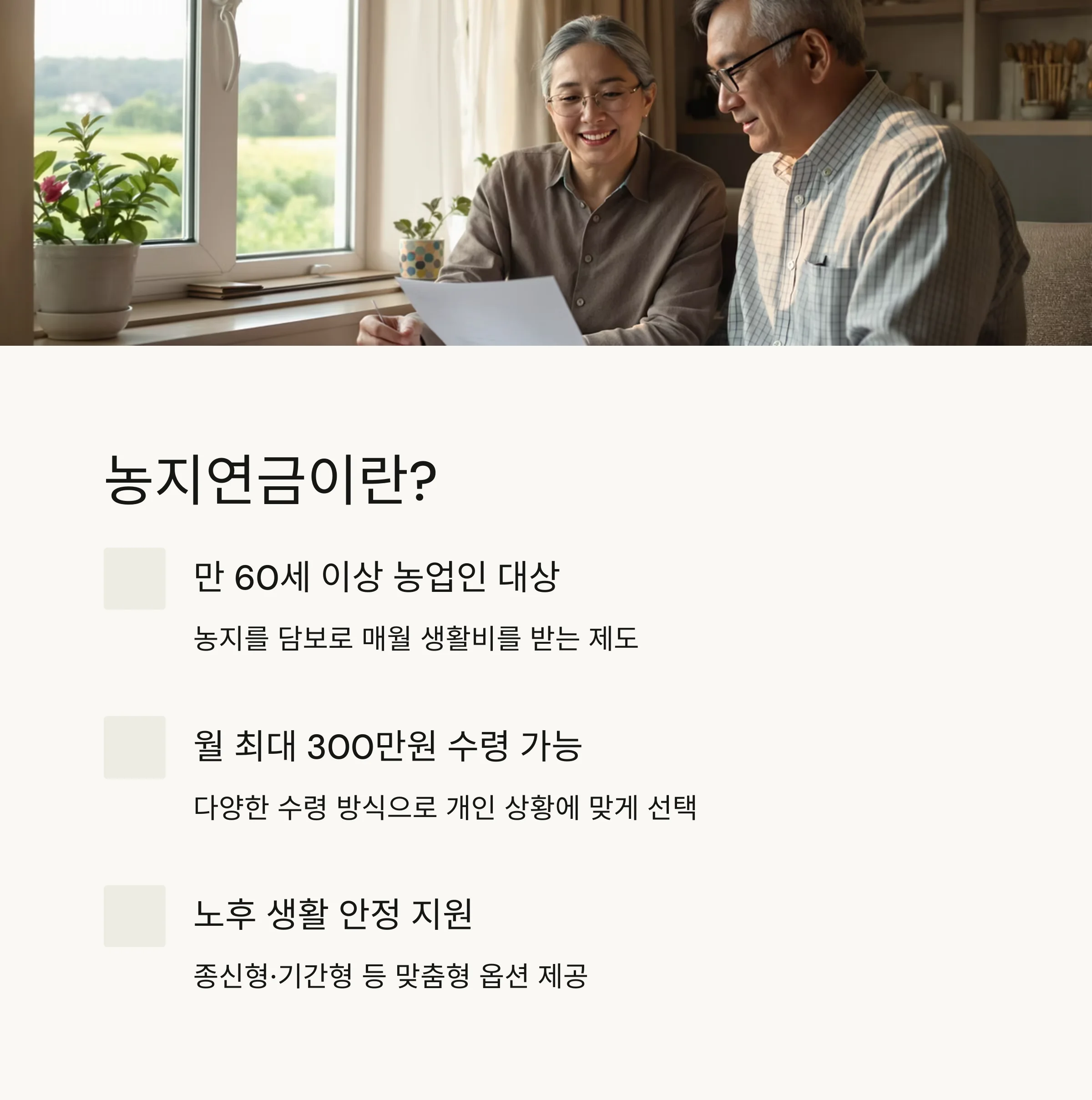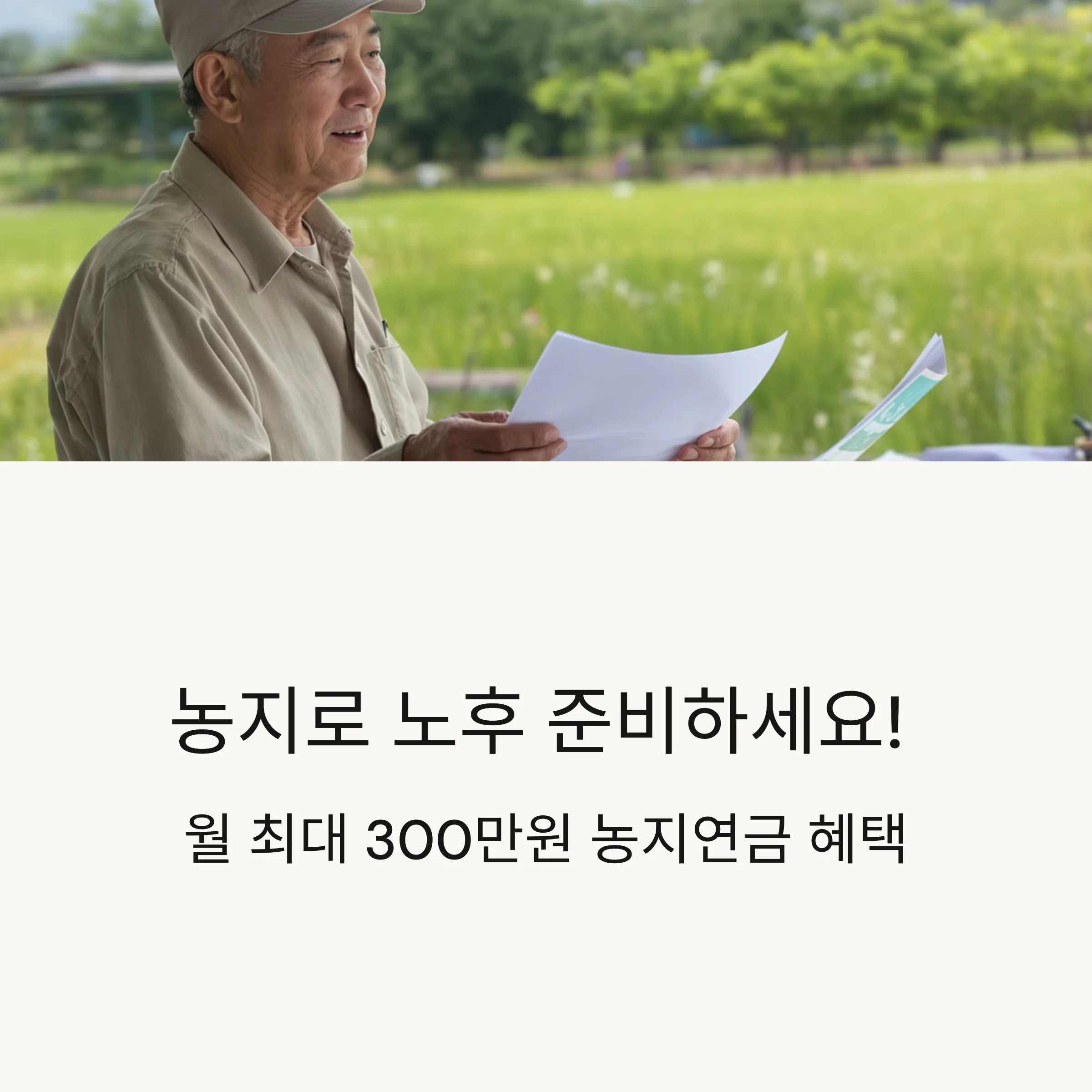 만 60세 이상 농업인이라면, 월 최대 300만 원까지 생활비를 수령할 수 있는 제도로,