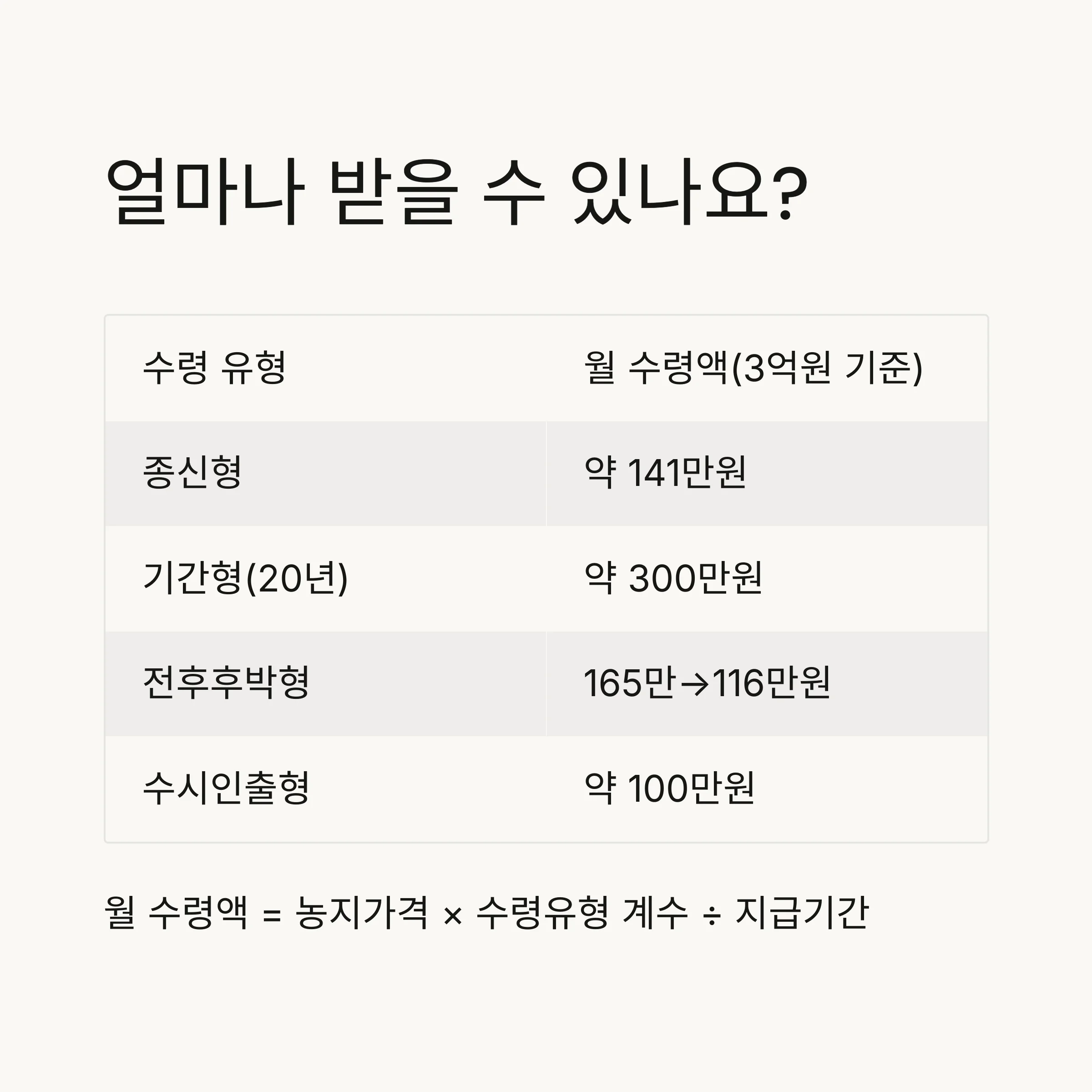 월 수령액 = 농지가격 × 수령유형 계수 ÷ 지급기간(기간형)