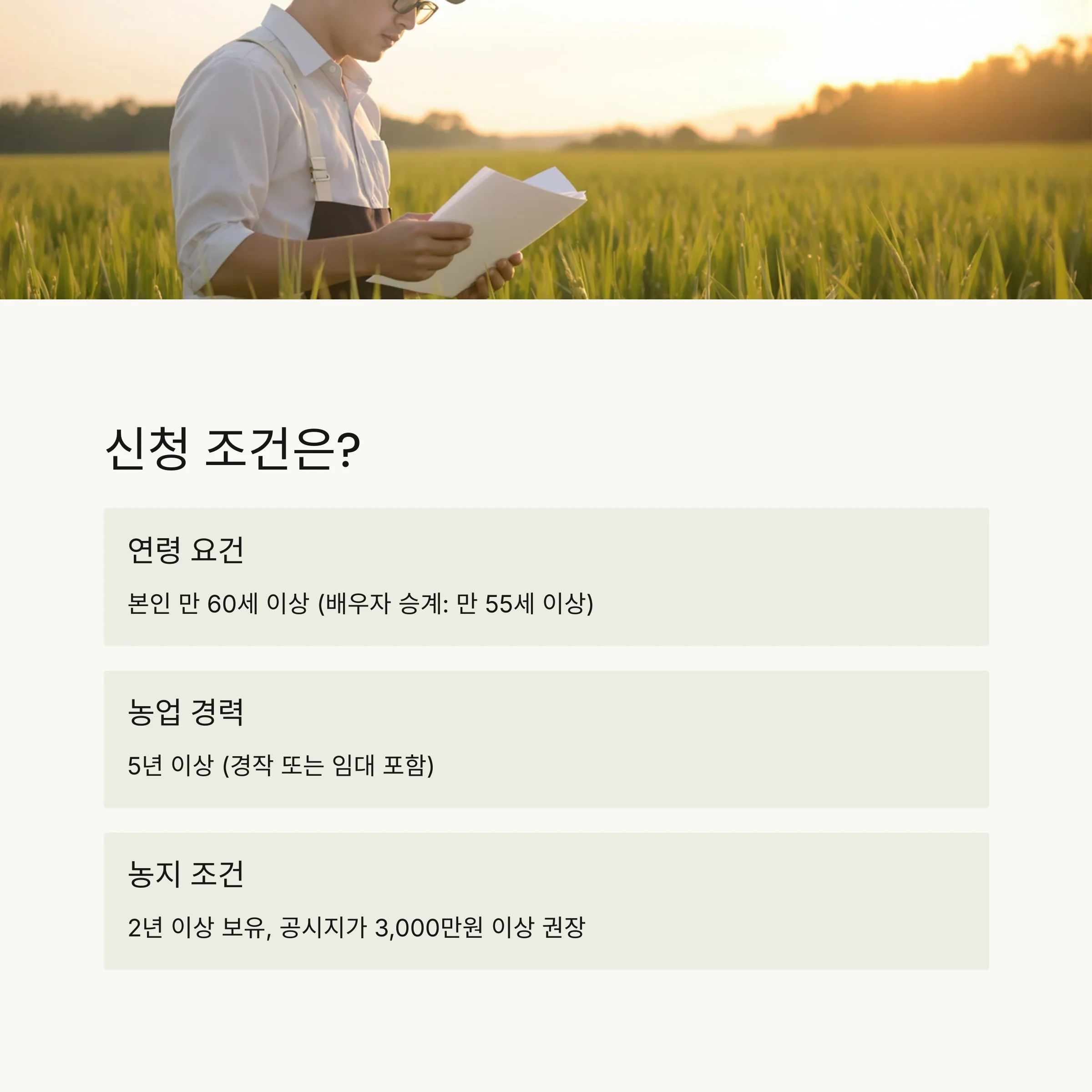 농지연금은 연령 요건 + 농지 조건 + 경력 요건을 충족해야 신청할 수 있습니다.